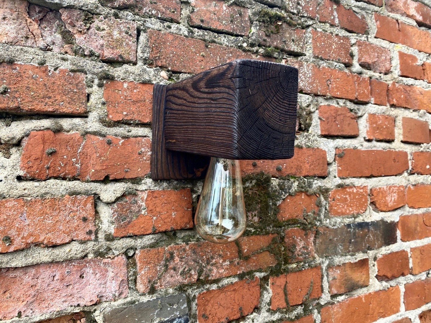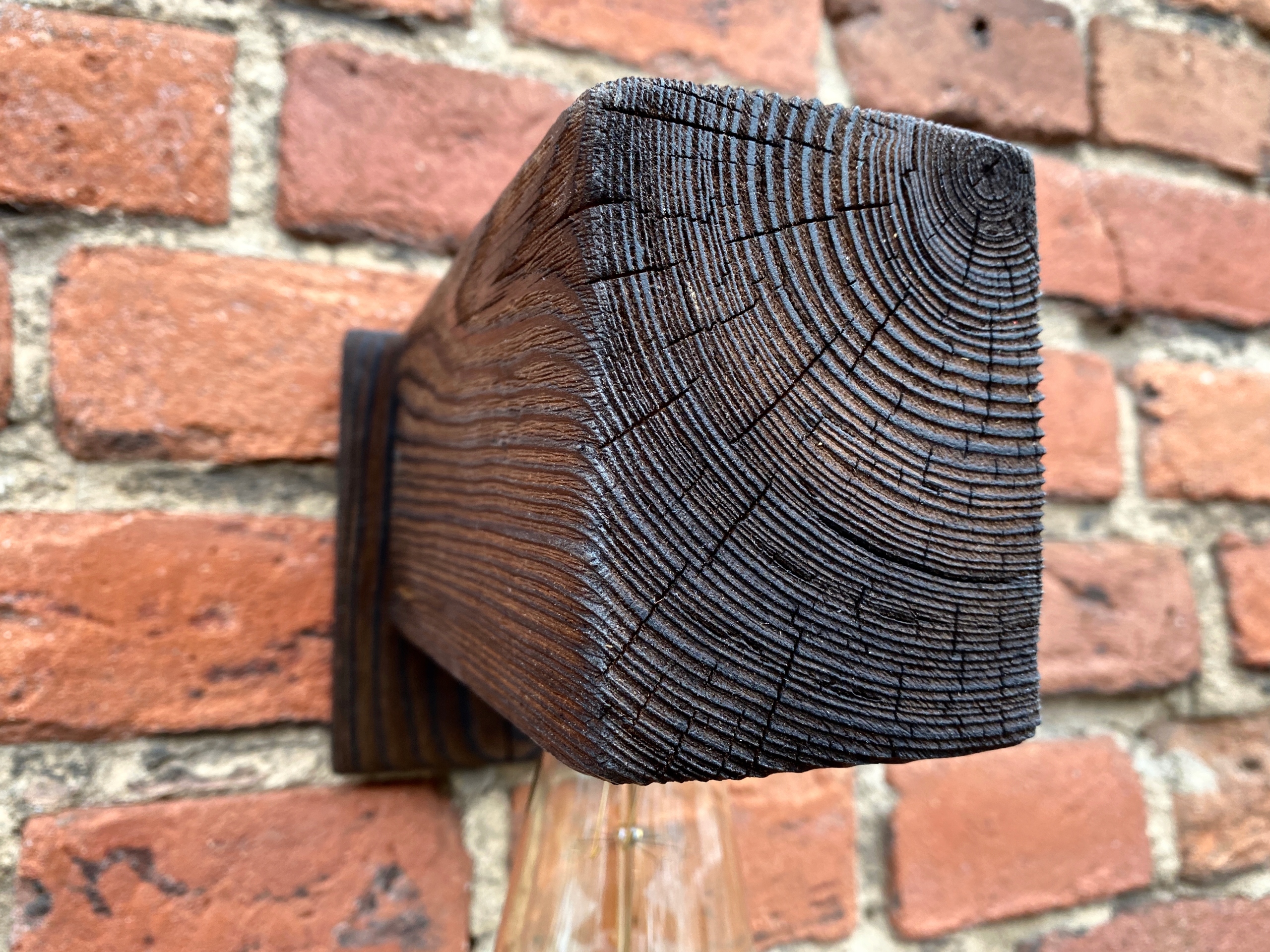 Drewniany kinkiet w stylu LOFT – Palone Drewno + dodatkowo napuszczone bezbarwnym olejem ( drewno nabiera ciemniejszego koloru )
