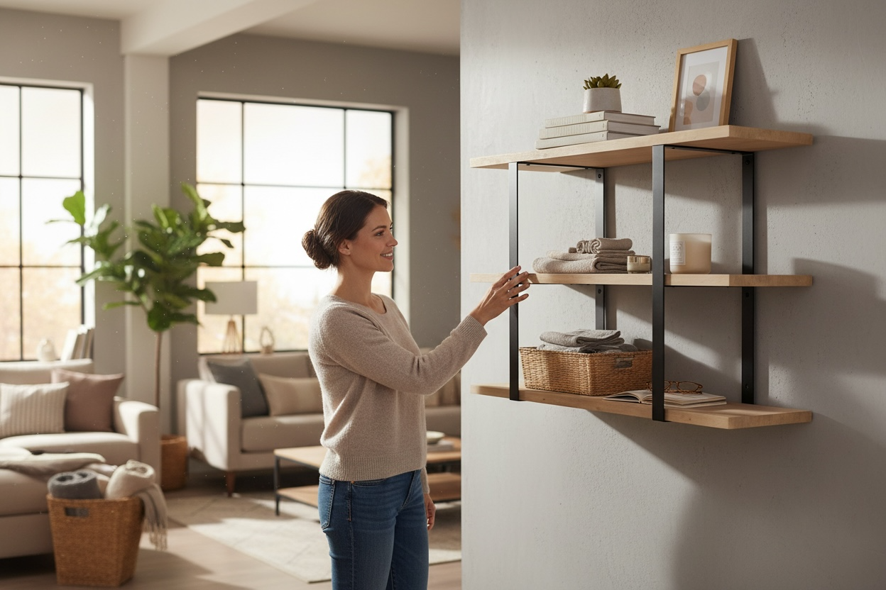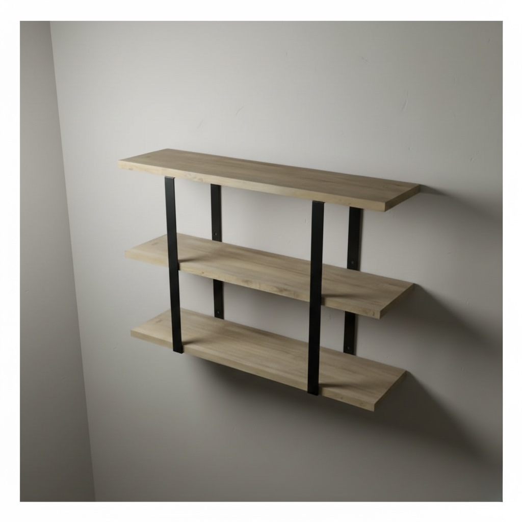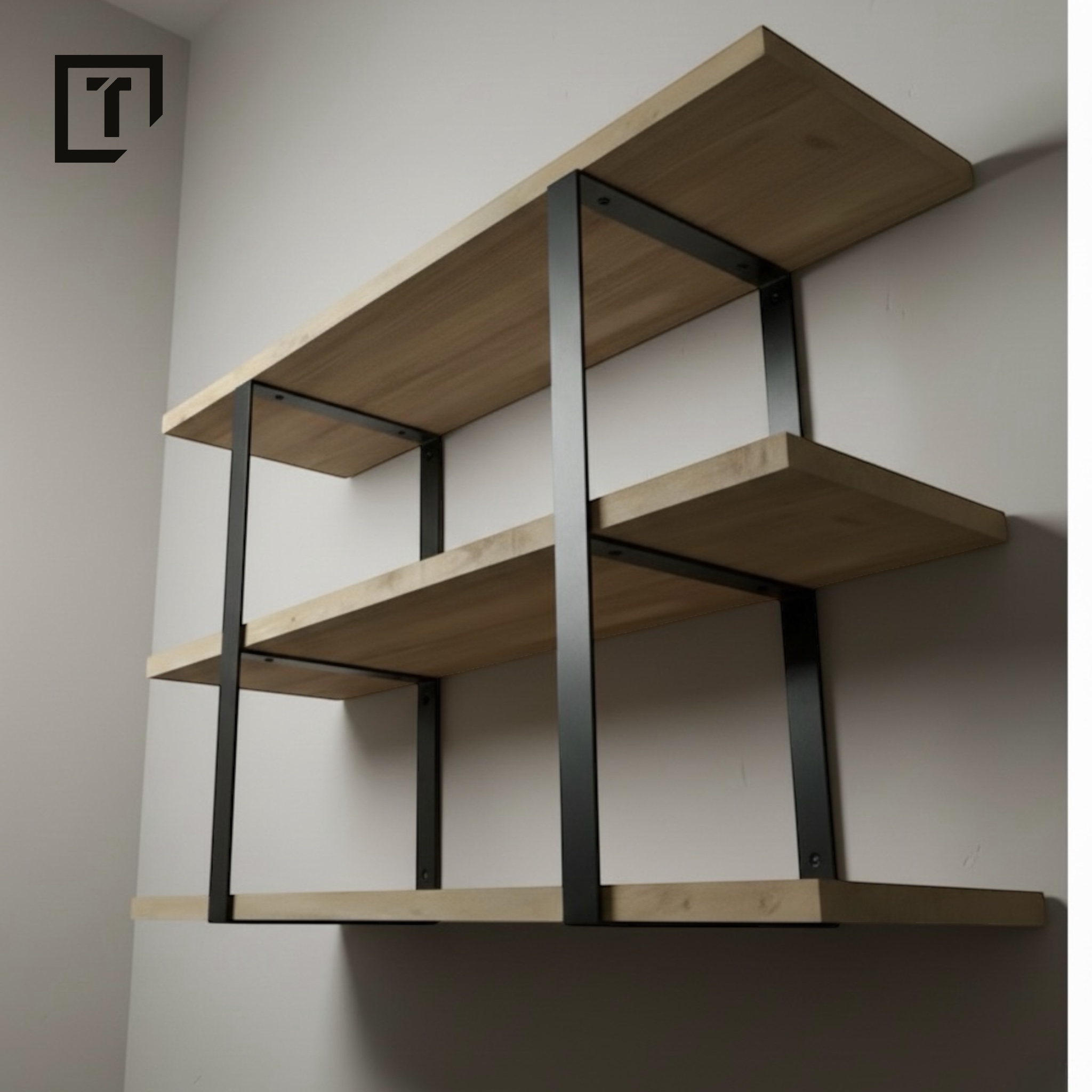 Ręcznie wykonany wspornik na trzy półki. Posiada otwory montażowe do ściany oraz do przytwierdzenia półek. Otwory z frezem w celu schowania główki wkręta. Półki widoczne na wizualizacji nie wchodzą w skład sprzedawanego produktu.